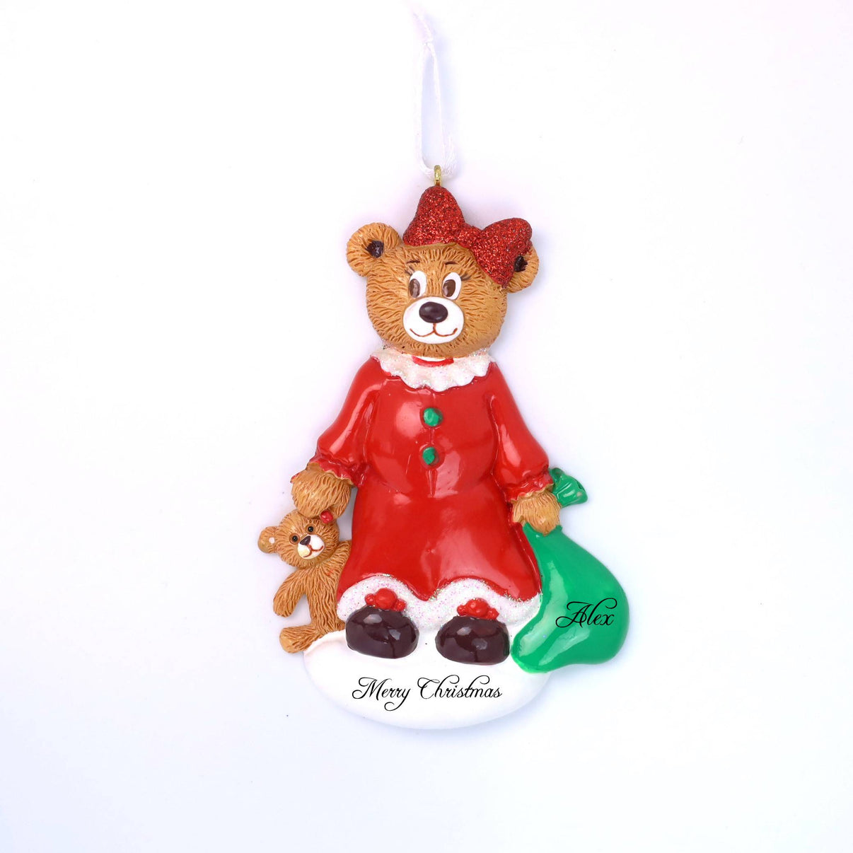 Drift into the sweetest dreams of the season with this RED SANTA BEAR GIRL ORNAMENT—a charming addition to any holiday tree! Dressed in a cozy robe and a classic sleeping cap, this sleepy little bear clutches a tiny teddy of its own, ready to snuggle into the magic of Christmas Eve.