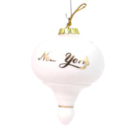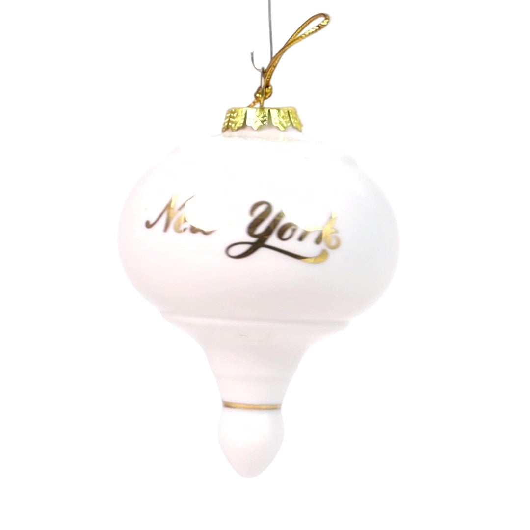 Elegance meets urban charm with this sleek, minimalist NY WHITE & GOLD TAPER PORCELAIN BALL ornament. Featuring a pristine white porcelain finish, this ornament offers a sophisticated and modern twist on traditional holiday décor. The striking "NEW YORK" inscription in gleaming gold adds a touch of luxury and makes this ornament a perfect tribute to the city that never sleeps.
